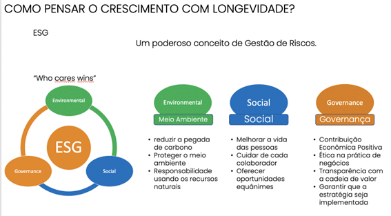 O ESG é um dos pilares do GCS – Gestão do Crescimento Sustentável, um método que apoia empresas a crescerem com resultados consistentes. Adotar uma abordagem de ESG é crucial para a sobrevivência e sucesso de qualquer negócio, pois ajuda a empresa no gerenciamento dos riscos do negócio e na criação de valor a longo prazo para todas as partes interessadas.